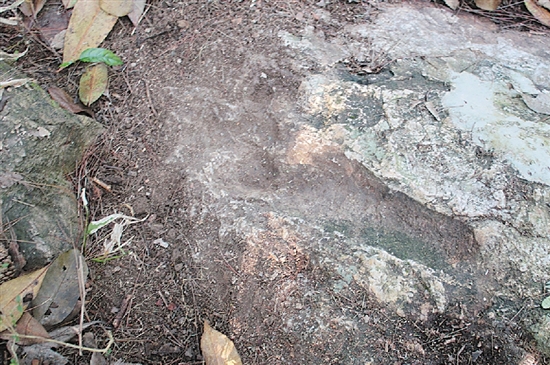 “神仙脚迹”是一处形状酷似人足印的石坑,脚后跟和前脚掌的轮廓清晰可见,好似水泥未干时被人踩了一脚。“村里传说这是神仙下凡踩出来的。”陈育说,“一脚能在石头上踩出印子,除了神仙,还有什么人能做到呢?”村民主任陈伟法赤脚踩上去比划,这个坑比成年男子的脚还要长10厘米左右。