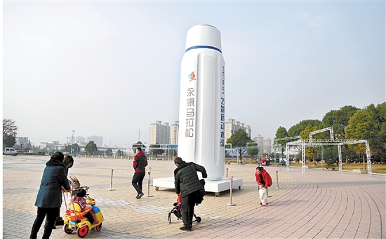 6日,我市半程马拉松标志性建筑之一的超大型运动保温杯入驻体育馆,该杯由我市飞剑公司打造,高7.2米,直径2.2米。