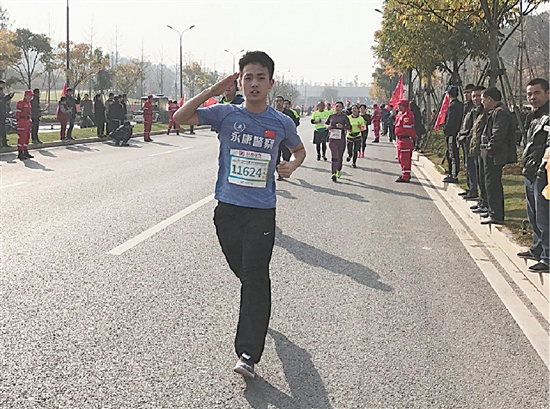 民警唐兵两个月前刚当上二孩的爸爸,因为工作和家庭的原因,唐兵最初想放弃12月举行的永康马拉松比赛,但想到这次比赛是家乡第一次举办马拉松,一番纠结后,他还是决定参加比赛。“我要将这次马拉松比赛的成绩卡送给我的孩子,希望他们未来能健康快乐。”比赛当天,唐兵的家人将孩子抱到了现场,见证了他的比赛。