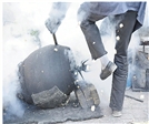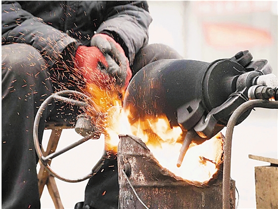 看似简单的“崩爆米花”却十分讲究技术,手和脚要并用,“崩”的时候,要将撬棍放在锅盖的纽扣上,而后用脚将其踹开,锅内压力形成的气流将爆米花带走。