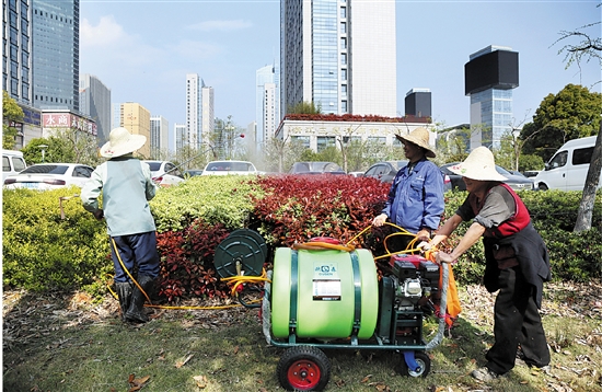 随着气温回升,园林绿化树开始抽枝发芽,为及时遏制病虫害的滋生和蔓延,近日,园林工人开展了药物喷洒作业。