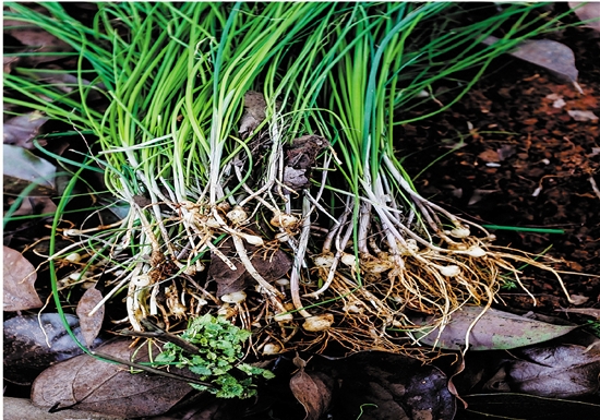 吕海莲把采好的野葱去除泥巴,随后把多余的枯燥的黄叶摘除。这一步看似简单却十分耗时。“因为是野生的,野葱扎根较深,杂草很多,带根部的葱可以拿来炒腊肉。”她说。