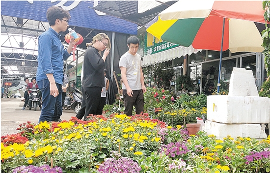 “菊花生命力其实很强,一般露天有雨水浇灌,又有阳光,就容易成活。而且我们选卖的盆菊一般都是刚开出一两朵花,还有很多含苞待放的花骨朵,不出意外至少可以盛开三四个月,管理得好来年还可以再开花。”鲜花店老板珍珍说,“除此之外,由菊花、康乃馨等花朵组成的小花篮也受到了年轻人的喜爱。”