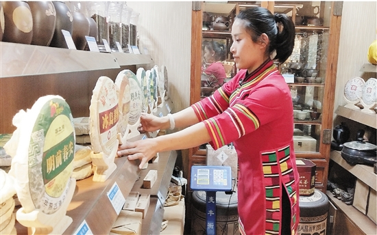茶行工作人员在整理茶制品