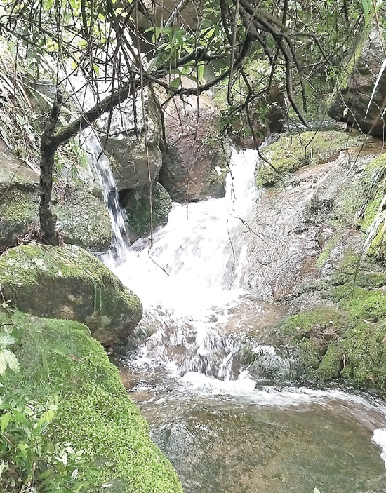 走出白云岩洞,隔着丛林竟看到对面山上金鸡洞飞瀑悬挂。“你们真是太幸运啦,我来来往往这么多次,能见到‘跌水崖’飞流直下景观的次数也是屈指可数呢!”应真山说,对面山上的金鸡洞里也有金鸡床等奇观,以前小孩子没地方玩,都要从太平坛爬到金鸡洞平展的金鸡床上睡觉。现在山上植被太茂盛了,找不到路了。