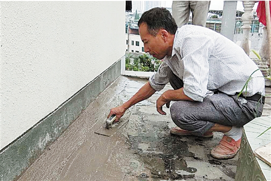 两天后,应师傅再次上门,在这条沟里蓄水。据应师傅介绍,蓄水是为了查看是否还存在漏水点,以便及时进行处理。又过了三天,应师傅上门检查,发现防水材料涂抹顺利,于是铺上混凝土作为保护层。