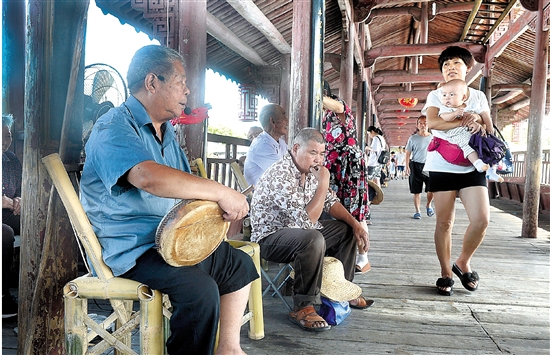 连日来,西津桥上每天都会响起有节奏的击鼓声,一位永康鼓词老艺人正用永康方言说唱。据了解,为宣传市非物质文化遗产,丰富市民文化生活,从本月16日开始,鼓词艺人轮流在西津桥表演,时间为上午8时30分至11时30分,下午1时30分至4时30分。活动一直持续到9月底。 记者 杨成栋 摄