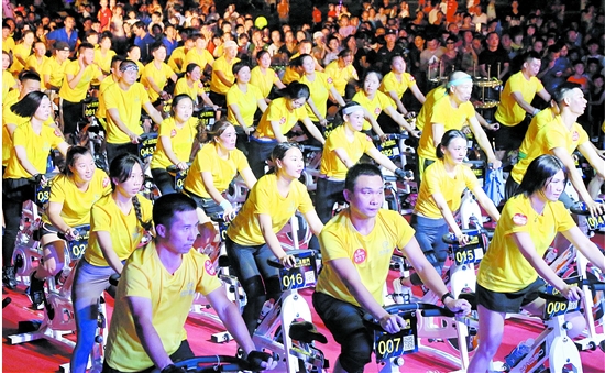 8日晚,市体育中心热闹非凡,由市体肓局和天鑫运动器材公司举办的“全民健身你我同行”第十个全民健身日活动正在这里举行,百人骑行单车、高温瑜伽、齐跳蹦床等12个项目展示让市民享受了一场精彩的体育健身盛宴。 记者 林群心 摄
