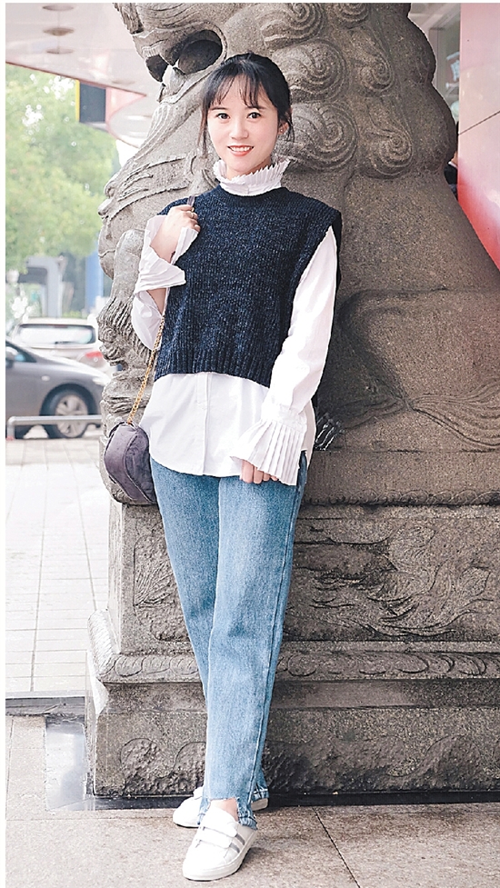 毛线背心绝对是今年秋冬的一匹黑马,它和衬衫俨然是营造简洁风、小清新的最佳拍档。最基础的藏蓝色背心搭配宫廷风的白衬衫,轻薄的质感缓和了毛线的沉闷,保持轻盈的同时,还能借机保暖。纯净的浅蓝色直筒牛仔裤让整个人在黯淡的秋冬看起来清爽干净了许多。