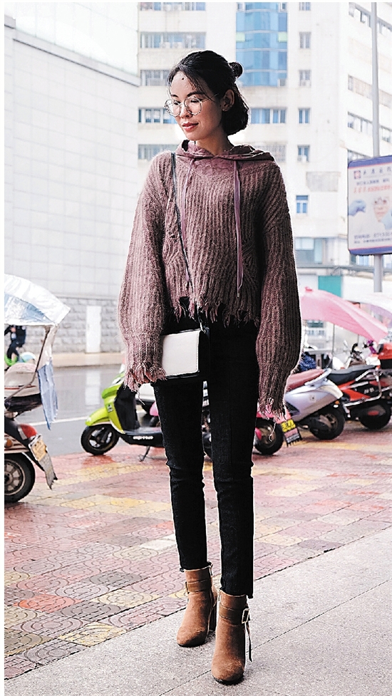 如果觉得单一面料太过枯燥,那就选择拼接的款式吧。粉紫色的带帽毛衣自有娇俏感,加之领口处的蕾丝拼接,更是与颇为严肃的秋冬形成了强烈反差。带有撕破设计的毛衣下摆,一条简单的黑色铅笔裤足矣。焦糖色的麂皮靴破除了色彩上的单调,为浑身添了一道暖意。