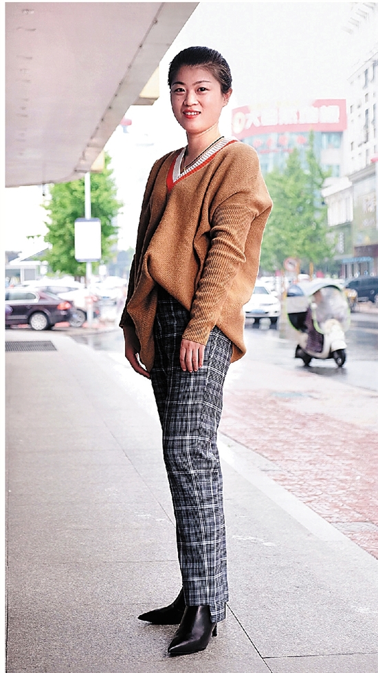 身着oversized毛衣时,下身建议搭配垂坠感好一点的裤子或裙子。鸡心领的oversized毛衣在原本随性的基调上,更显露了一丝学院气质。下半身的格纹直筒裤起到了承上启下的效果,前短后长的裤脚微微现出帅气的尖头皮鞋。色系的逐步下沉,造就了混搭又不突兀的一身。