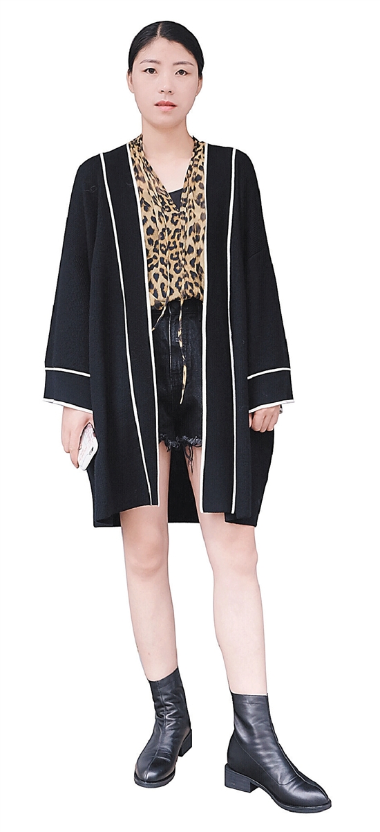 中长款的毛衣外套在这个季节非常实用,很适合梨型、苹果型身材的姑娘,因为显壮的地方基本上都遮住了。白色线条在黑色毛衣上构成强烈对比,令原本不显眼的外套瞬间立体起来。内里用豹纹来搭配,看似张扬,却意外的和谐。而干练的短裤和短靴再度将这份帅气升级。