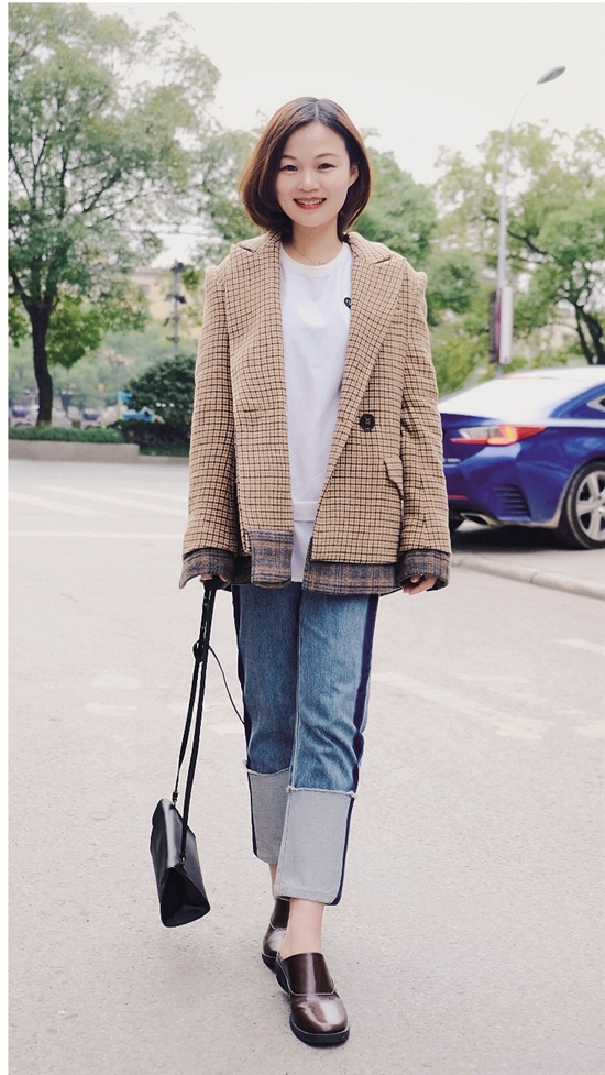 如若忌惮格纹西装的正式感,可以挑选一些街头感强的单品来中和,比如直筒卷边牛仔裤就非常合适。想要营造休闲风格,完全不需要过多的装饰,只需再内搭一件平易近人的白色T恤。牛仔元素和白色系都是超减龄的单品,两者能把西装外套衬得一点儿都不死板。这样的摩登混搭反倒夺人眼球,还自带青春气息。