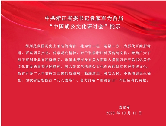 袁家军书记在10月10日的批示中指出:“胡则是我国历史上著名的清官,他为官一任、造福一方,为历代百姓所称道。研究胡公文化、传承胡公精神,对于弘扬浙江优秀传统文化、激励广大干部干事创业具有积极意义。”
