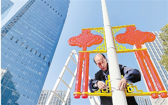 春节临近,年味渐浓。近日,记者在总部中心看到,工作人员正在灯杆上挂火红的中国结。