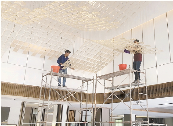 近日,8890平台加盟商曼联家政有限公司的师傅来到一家房产公司展厅,搭起脚手架,为客户清洗水晶灯。