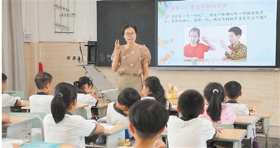 在后吴小学的一间教室内,丁萍正在配合市教师进修学校附属小学科学教师,以“互联网+”的形式进行教学(见右图)。十年间,丁萍是城乡教育均衡化、集团化的亲历者。