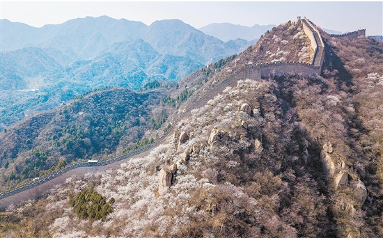 3月30日,春日的京郊,山花遍野,与长城相映成景,引人入胜。
