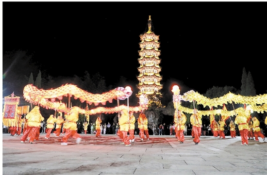 作为去年参与“龙腾方岩”的一员,方岩镇象瑚里村村民徐晓对庙会的感受记忆犹新。夜幕降临,在由两块对峙的虎口巨石形成的天然关隘中,锣鼓队、扛旗队、舞龙队沿着方岩步道拾级而上,四条彩色布龙分两路迎上方岩,纵穿天门、舞动南岩,祈祷风调雨顺、事事顺心、永葆安康。