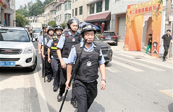 “警保民”最小共治单元安保人员在第二届锦绣黄桃节上开展巡逻工作