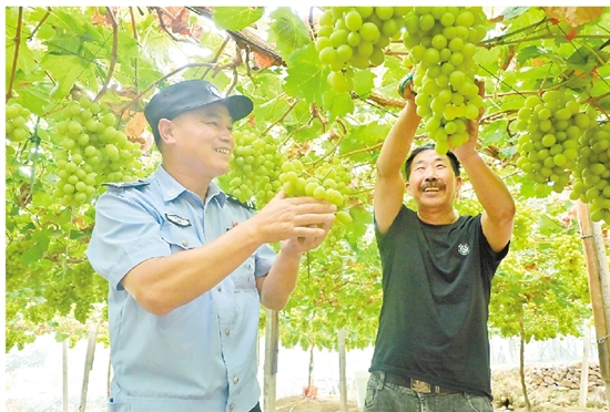 唐先镇盛产葡萄和生姜,7月至10月是葡萄的丰收季。在此期间,唐先派出所专门组建“葡萄守护联盟”,联动各方“果园卫士”为葡萄丰收保驾护航。某天夜晚,“果园卫士”正在巡逻时,发现一名形迹可疑的男子在农户的葡萄园附近徘徊。巡逻人员迅速上前询问,成功阻止了一起潜在的盗窃行为。