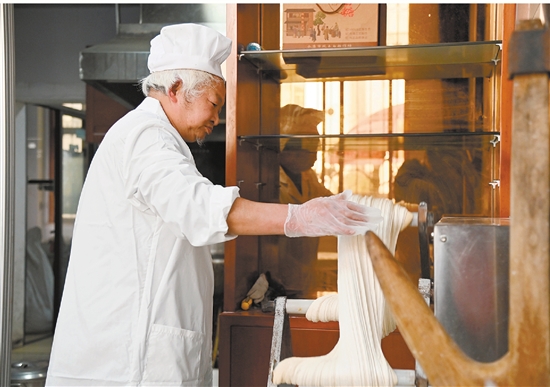 12月18日,唐先镇尖山湾村一家作坊内,农户把熬制好的金黄色麦芽糖块缠绕在工具上,经过一次次拉扯,麦芽糖块逐渐变成白色,取下后捏成长条状剪成段,做成美味的麦芽糖。