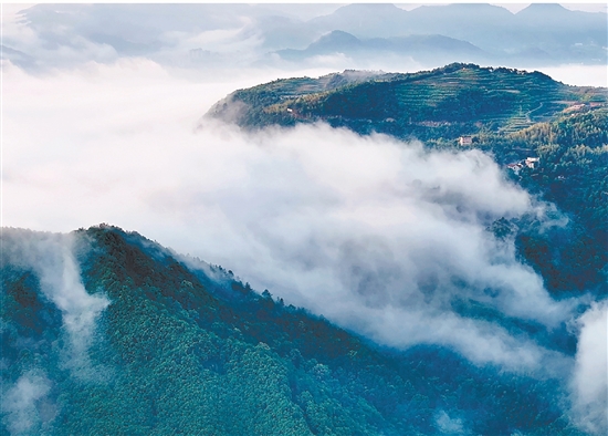 6月3日,前仓镇历山附近出现云海景观。山间水汽升腾,形成团团云雾,群山在朦胧“白纱”掩映下半遮半露,森林轮廓若隐若现,构成了一幅宏大而梦幻的自然画卷。