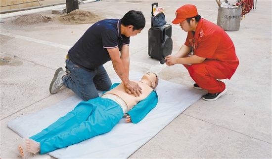 在心肺复苏应急培训环节,工作人员借助道具现场演示整个急救过程的操作要点。员工还积极进行现场试练,进一步巩固操作技巧。