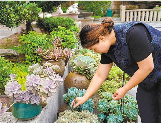 俞同恩夫妇平时工作繁忙,周末才回村里。院子改造后,一盆盆用心栽种的花木成了他们心头的牵挂,平日里也时不时要回来看看。“像多肉,天气炎热要避雨,天气寒冷要防冻。有时候一看天气要下雨,我就赶回来给它们遮雨。虽然有点麻烦,但心里喜欢。”陈国静笑着说,看似是人养花,其实是花养人。沉浸式照料花草,让她卸下烦恼,缓解疲惫,十分治愈人心。