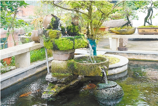 水池中的流水景观很是独特。整个景观由数个形状不一的石板堆叠而成,水流自倾斜的陶罐口奔流而下,顺着石板凹槽里的出水口一路向下流淌,汇入池中。一眼看去,石板上长着深浅不一的青苔,石板下鱼儿嬉戏,很有野趣。