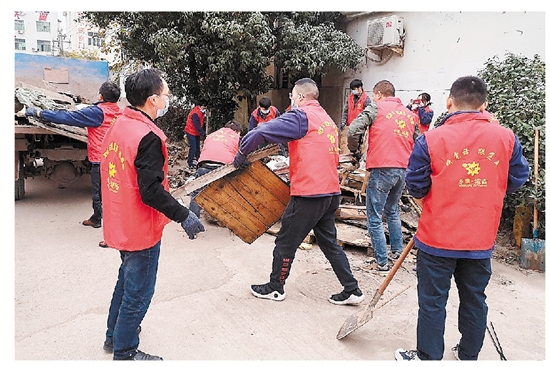 ①网格员和企业员工携手清理环境 ②“门前三治”行动 ③执法人员指导商户进行垃圾分类 ④在建工地专项整治