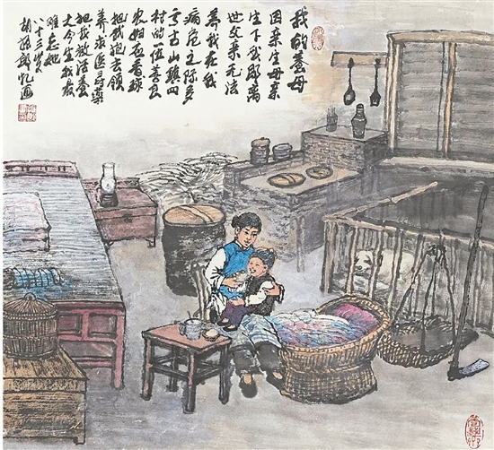 该画名为《我的养母》。因我母亲生下我即去世,上有哥哥又小,父亲无法养活我,在我病危之际,多亏古山四村的一位善良农妇应香球把我抱去领养,求医寻药,把我救活养大。今世我最难忘怀她的恩情。