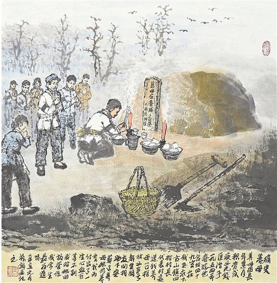 该画名为《痛失养母》。养母因长年累月积劳成疾,又无钱医治,于1954年春去世,仅49岁。她为养育我而付出了一生心血,可没等到我的报答,是我今生最大的遗憾。