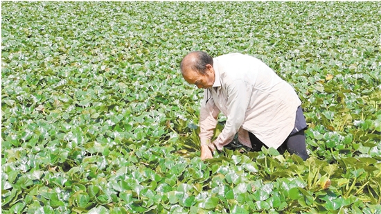 眼下正值菱角成熟季。近日,唐先镇太平新村的连片菱塘里,碧绿的菱叶铺满水面,村民娴熟地翻开菱叶,采摘新鲜菱角。