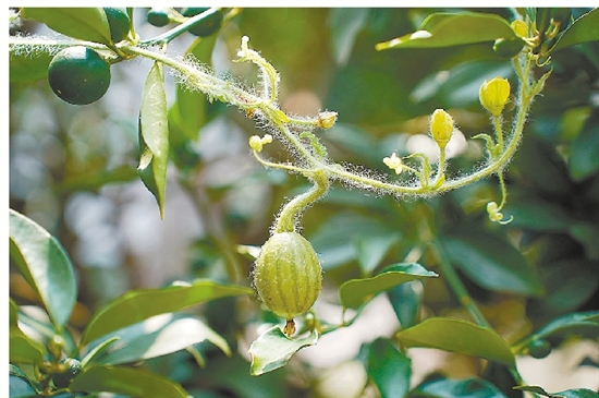在柚子树的树干上,记者发现一根绿藤缠绕其间,上面长满了翠绿的叶片。