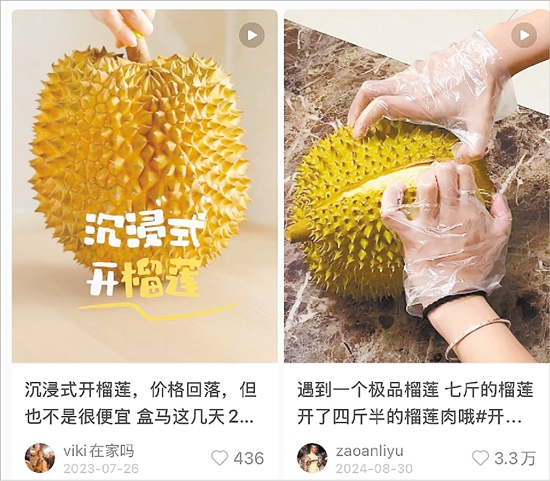 “没想到一个不大的榴莲,果形也有点歪瓜裂枣的,居然能开出满满两盒果肉,真是不可思议。”“00后”市民陈琳向记者表示,尽管她不喜欢吃榴莲,但热衷于在小红书和B站观看别人开榴莲的视频解压。“不用自己真金白银掏钱,就能满足好奇心,获得成就感。看得多了,还可以学到一些挑选榴莲的技巧。”她说。