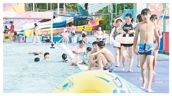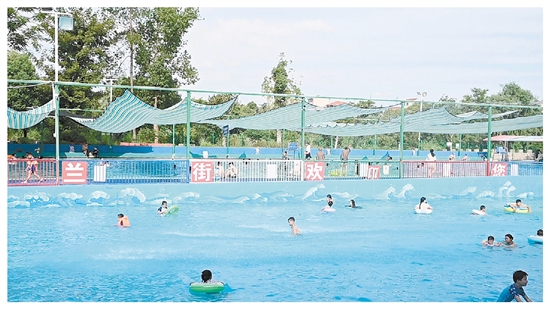 8月18日15时,东城街道兰街村的嘻水乐园迎来了客流高峰。不少市民在冲浪区、游泳区体验玩水的乐趣。