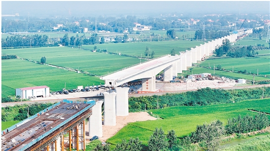 8月28日,潍(坊)宿(迁)高铁郯城沭河特大桥上跨胶(州)新(沂)铁路T构梁顺利完成转体作业,为后续箱梁架设打下了坚实基础。据悉,潍宿高铁是京沪高铁辅助通道的重要组成部分。 新华社发(郭绪雷 摄)