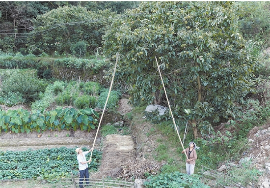 9月16日,在唐先镇石湖坑村,村民徐云芝和成伟旗手持竹竿熟练地采摘板栗。据悉,该村种植板栗历史悠久,几乎每户家庭都有几十株板栗树。 融媒记者 胡东来 摄