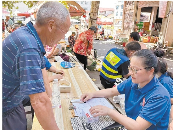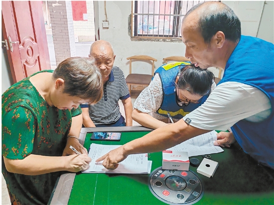 志愿者向老人宣传定位器