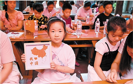 在国庆主题竹编画制作环节,大家一起学习竹编基础技艺,并将五星等元素巧妙编入画中,感受非物质文化遗产的魅力。