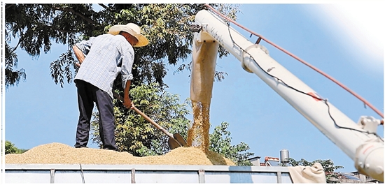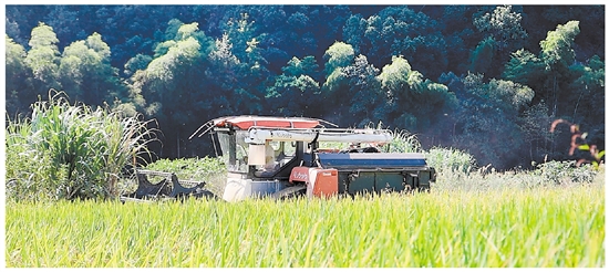 机械化作业大大提升了收割效率。三台收割机日均作业面积超过100亩,截至目前已完成200多亩的收割任务。“从目前情况看,今年亩产约600多公斤,比去年提高100多公斤,属丰收年景。”李炜斌分析,产量提升主要得益于今年天气适宜、雨水充足。