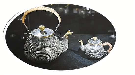 国家级技能大师、永康市掌声工坊艺术馆馆长程志芳带来的金属雕作品《丹凤朝阳子母壶》,壶身凤羽层次分明,细腻如发丝。该作品既继承了传统金属雕刻技艺,又巧妙融合现代抽象造型与极简线条,展现出独特的艺术魅力。“这次展览让更多人感受到传统工艺与现代设计结合产生的奇妙化学反应。”程志芳说。