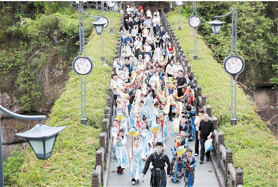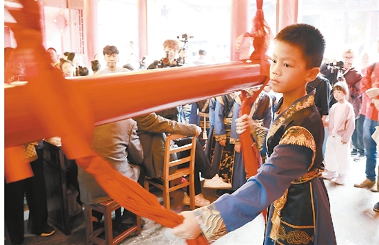 10月19日上午,方岩庙会系列活动之“十岁敬胡公 励志知而行”在方岩山举行,来自全市14所小学的50名学童与上百名家长参加。活动分为序章、仪仗游巡、正衣冠、敬胡公、明志向、知而行、向未来等环节,希望孩子们以先贤为榜样,传承胡公精神,成为栋梁之材。 融媒记者 卢斌 摄