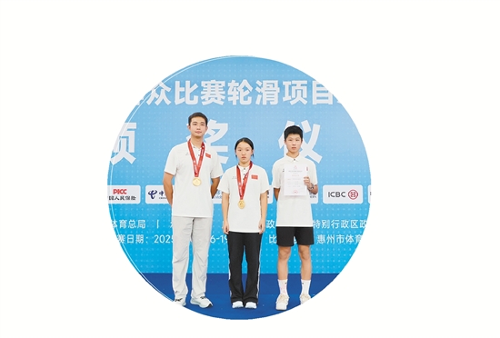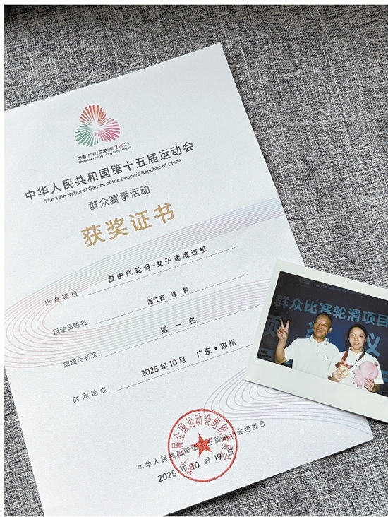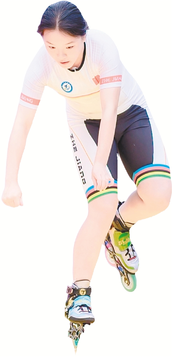 这位16岁的女将履历亮眼:5次拿下全国自由式轮滑锦标赛速度过桩冠军、浙江省第十七届运动会自由式轮滑速度过桩女子乙组冠军、第19届亚洲轮滑锦标赛自由式轮滑青年女子速度过桩冠军……但刚拿下的这枚金牌,对徐菁来说有着更加特别的意义。