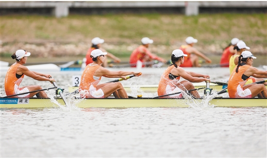 11月11日,第十五届全国运动会赛艇项目女子四人单桨决赛在广州举行。最终,湖北队选手获得冠军。图为湖北队选手在比赛中。
