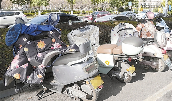 记者先后来到总部中心、万达广场、市第一人民医院等人流密集区域看到,非机动车停放区域的电动自行车挡风被使用比较普遍。这些挡风被厚薄不一,且分为全包款、分体式两种。其中,全包款从车头覆盖至脚踏,脖挡、手套、下摆全部连为一体,就像一床厚被子严实盖住骑行者承接冷风的前半面。“风都是迎面直接吹过来的,不挡着点真要被冻坏了。”市民王雪说道。