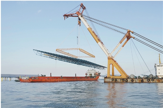 近日,中国华电集团有限公司河北分公司在河北省昌黎县海域投资建设的河北省海上光伏电站试点项目,正在按照节点要求扎实推进。图为12月24日,工人在位于昌黎县海域的海上光伏电站试点项目建设工地操作机械设备作业。
