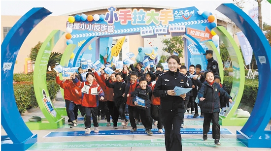 入校园。自2025年11月起,永康公安联合教育局开展“小手拉大手——我是小小反诈官”主题校园巡展暨小小反诈官招募活动,深刻剖析、直白揭露青少年群体常见诈骗犯罪的新手法、新特点,实现“教育一个孩子,影响一个家庭,辐射整个社会”的良性循环,推动青少年群体从“反诈学习者”成长为“防诈传播者”。目前,已完成5站巡展、10场活动,覆盖师生及家长超4000人次。