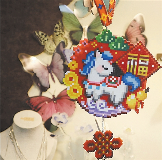 指尖轻捏镊子,彩色拼豆颗粒精准嵌入模板,市民王雨菲的马年主题拼豆春联已初见雏形。憨态可掬的卡通小马扬起前蹄,旁边缀着金灿灿的元宝与“福”字,创意十足。